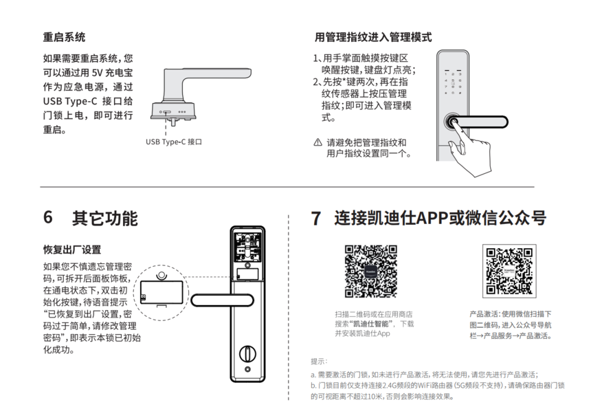 进入配网流程选按“4”选择进入配网(先要下好凯迪仕智能APP),打开APP右上角扫码(电池后盖二维码),去配网,以激活,一直下一步凯迪仕智能想加入无线局域网“凯迪仕APP",输入前面修改过的管理员密码,再输入家中的wifi名称和密码。此时要注意:把自己路由器的频段设为2.4G,才能顺利进行指纹锁和手机APP的连接。过程需要一些时间,耐心等待就行。 三,设置成功后,除了指纹密码刷卡钥匙等开门方式外,通过手机APP也同样能达到远程开锁。